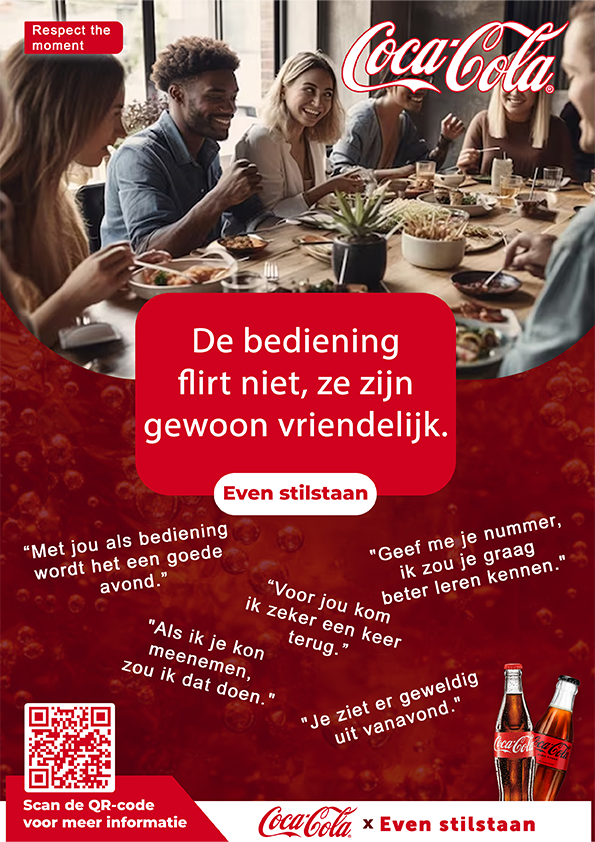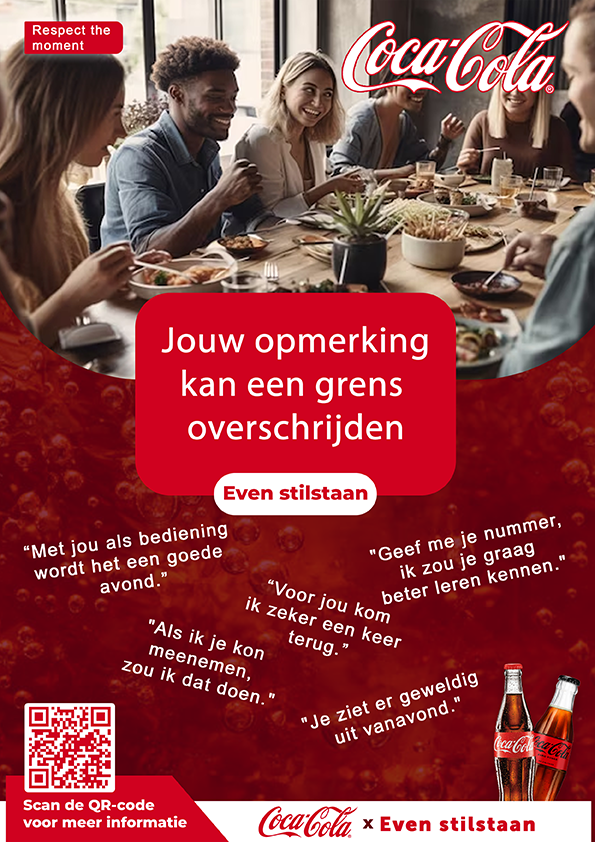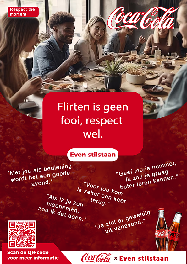 De campagne ‘Even Stilstaan’ is gericht op het bevorderen van respectvol gedrag in de horeca. We willen gasten bewustmaken van de impact die hun opmerkingen kunnen hebben op jonge vrouwelijke medewerkers. Met visuele middelen zoals posters, bierviltjes en menukaarten zorgen we ervoor dat gasten op een subtiele manier worden herinnerd aan het belang van respect.